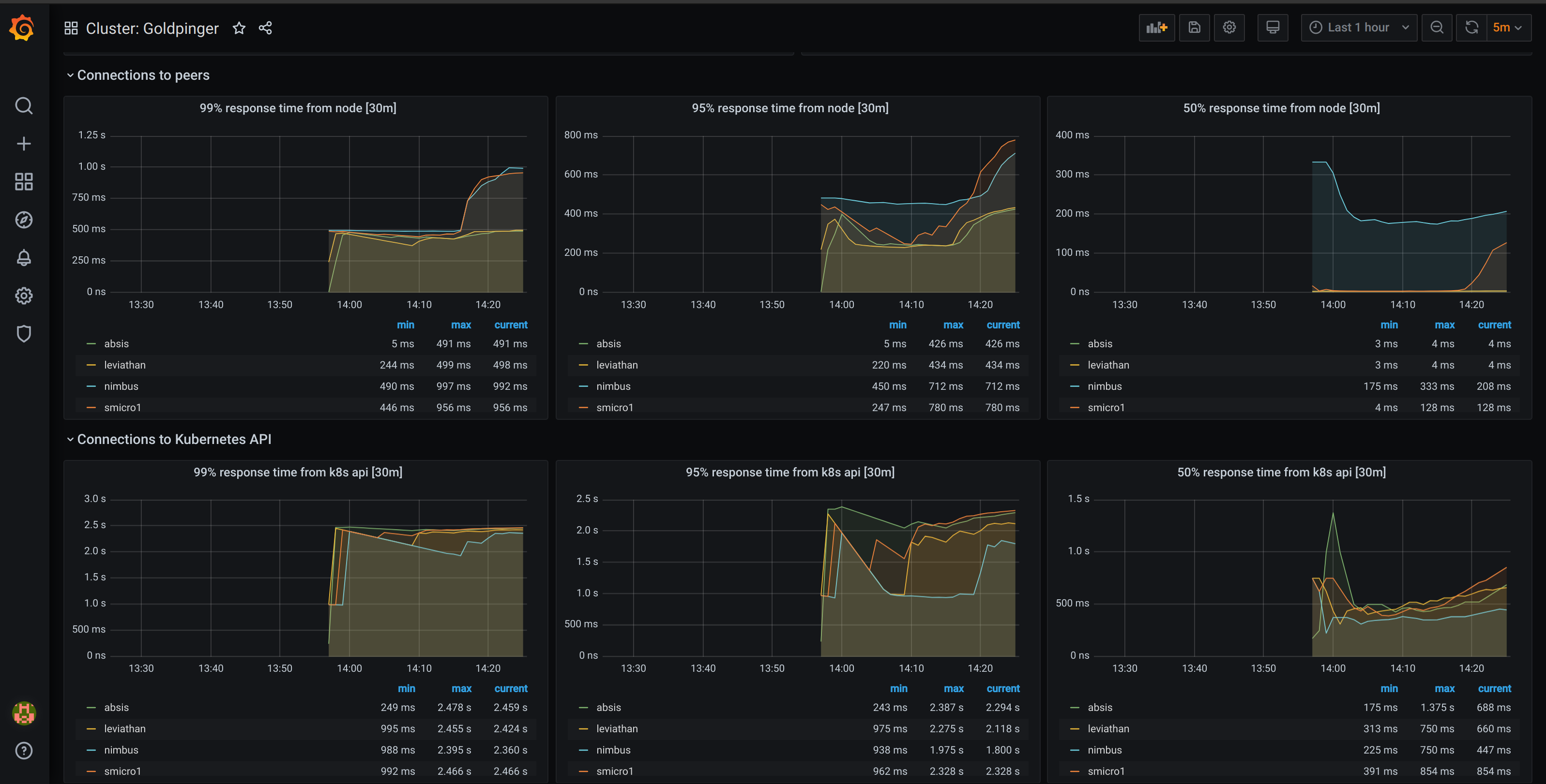 I installed goldpinger to help me learn more about how my Kubernetes cluster was handling the latency. Goldpinger monitors latency in your Kubernetes cluster by deploying a mesh of daemonsets. The daemonsets ping each other over HTTP to track inter-node latency tracks Kubernetes control plane latency.